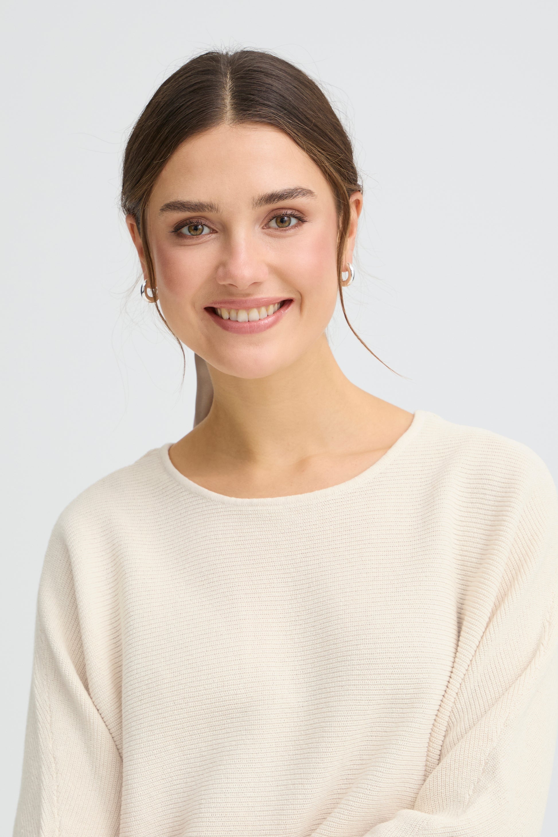 A fab little knit from Scandi brand FRANSA in a horizontal ribbed fabric. The three quarter sleeve sits at a flattering length. The knit stops at hip level and has a scooped hem and slightly batwing sleeves. A great all rounder in a neutral or a bright colour.
