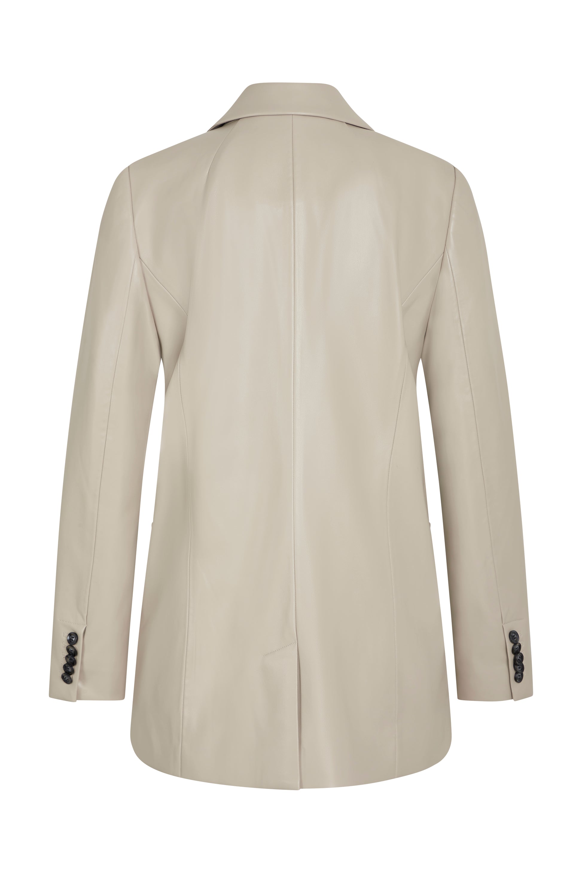 Classic tailored blazer with a lapel collar from Bruuns Bazaar . Featuring front flap pockets and a double-breasted six button fastening at the front. Made from Vegan leather this is super soft and classic. The fit is true to size. Fully lined piece. Although the colour is called Silver Cloud this is more of a creamy colour.