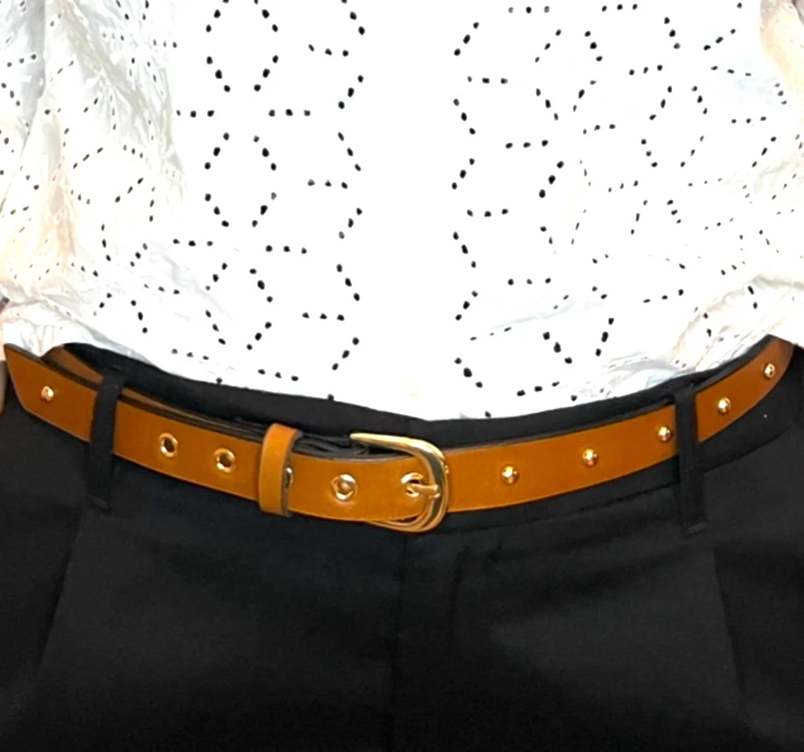 Hand made in our caramel waxy nappa leather with full leather lining, gold colour buckle, domed studs and added eyelets, our Mahi leather belt has been sized to fit as a jeans belt.