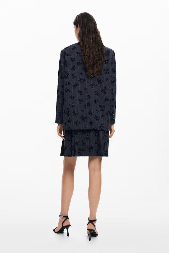 The Zagrez jacket by Spanish brand DESIGUAL is a fabulous statement blazer in a grey pinstripe with a black flock style embossed flower throughout. A classic style blazer with a faux breast pocket and two front pockets with flap. Single breasted with two fabric coloured buttons. Fully lined and true to size.